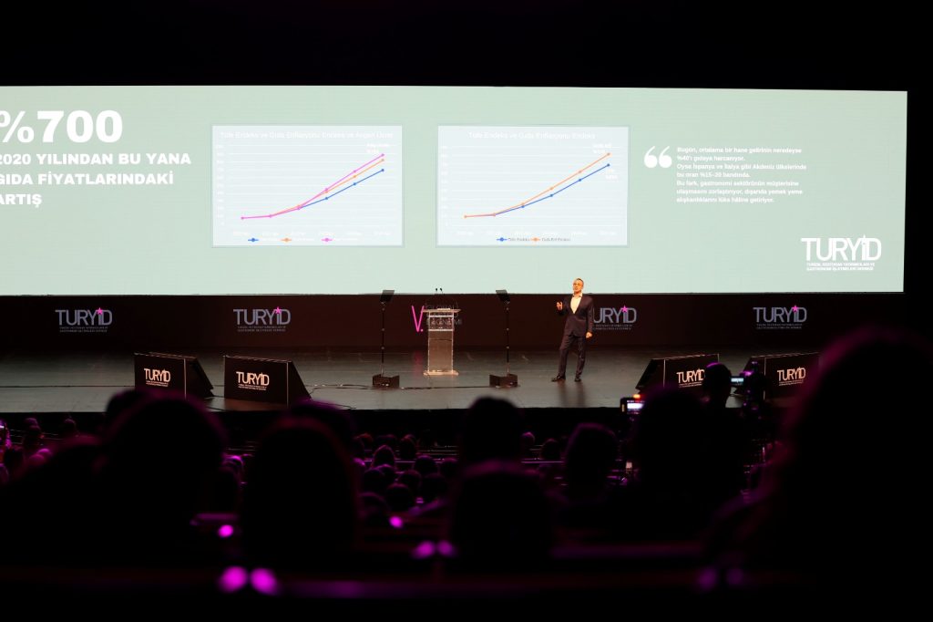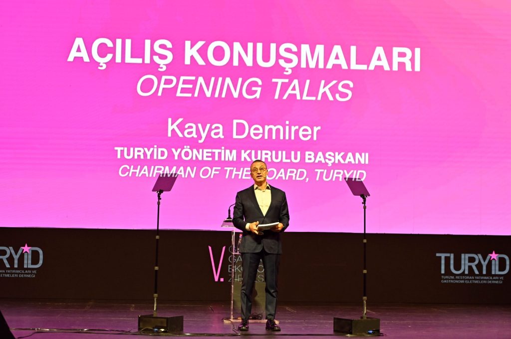 Açılış konuşmasında TURYİD Yönetim Kurulu Başkanı Kaya Demirer, gastronominin artık yalnızca bir keyif alanı değil, milyarlarca dolarlık bir ekonomiyi yöneten stratejik bir sektör olduğunu vurgularken şöyle devam etti: “Coğrafya kaderdir derler. Evet, yaşadığımız zorluklarda coğrafya bir kaderdir belki; ama aynı zamanda gastronomi açısından yaratıcılığın, deneyimin ve çeşitliliğin kaynağıdır. Anadolu’nun bereketli topraklarından Akdeniz’in zeytinliklerine, Karadeniz’in balıkçısından Mezopotamya’nın buğdayına uzanan bu coğrafya, miras olmanın ötesinde aynı zamanda taşıdığımız bir sorumluluk. Gastronomi tabakları aştı. Artık tarlada, denizde, pazarda, kültürde ve hatta politikada şekilleniyor.”
