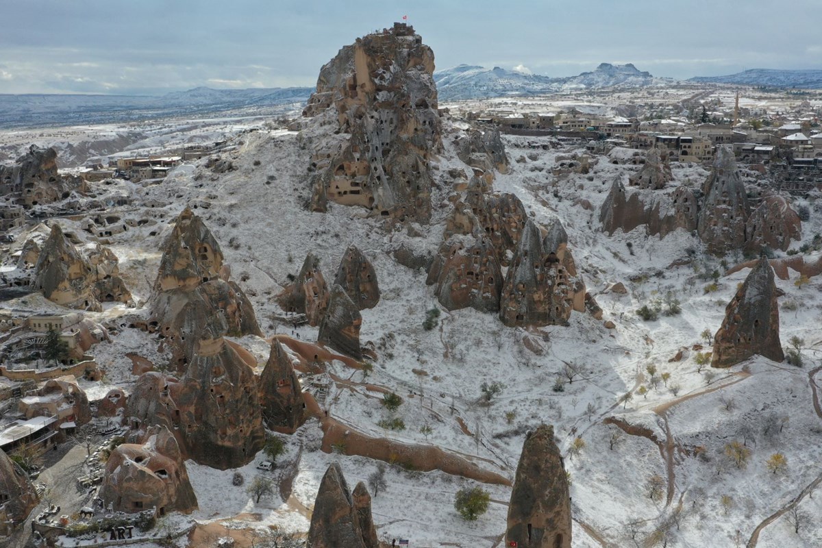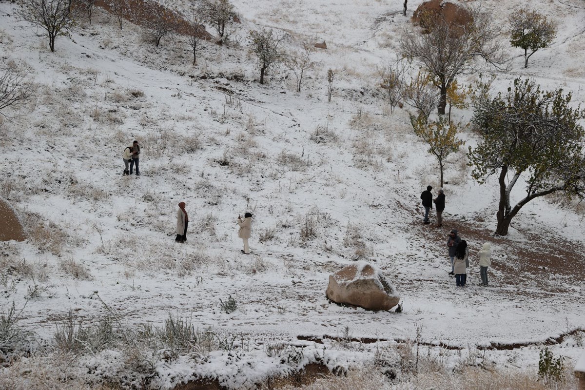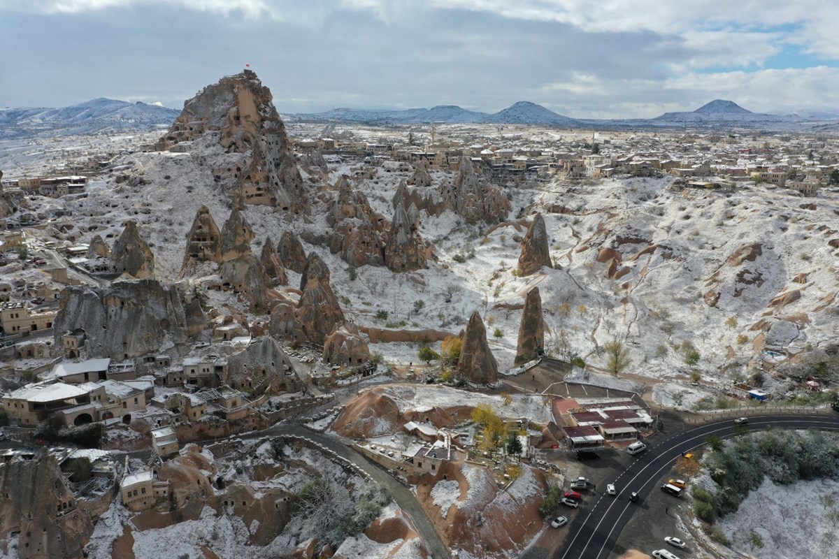Yaklaşık 3 saat süren kar yağışının ardından UNESCO Dünya Mirasları Listesindeki Kapadokya’da peribacaları ve doğal kaya oluşumlu vadiler, kar yağışının ardından karla kaplandı.Sabah saatlerinde etkili olan rüzgar nedeniyle iptal edilen sıcak hava balon turuna katılamayan turistler, vadilerde gezinti yaptı.Turistler, kar ve peribacalarının oluşturduğu manzarayı fotoğrafladı.