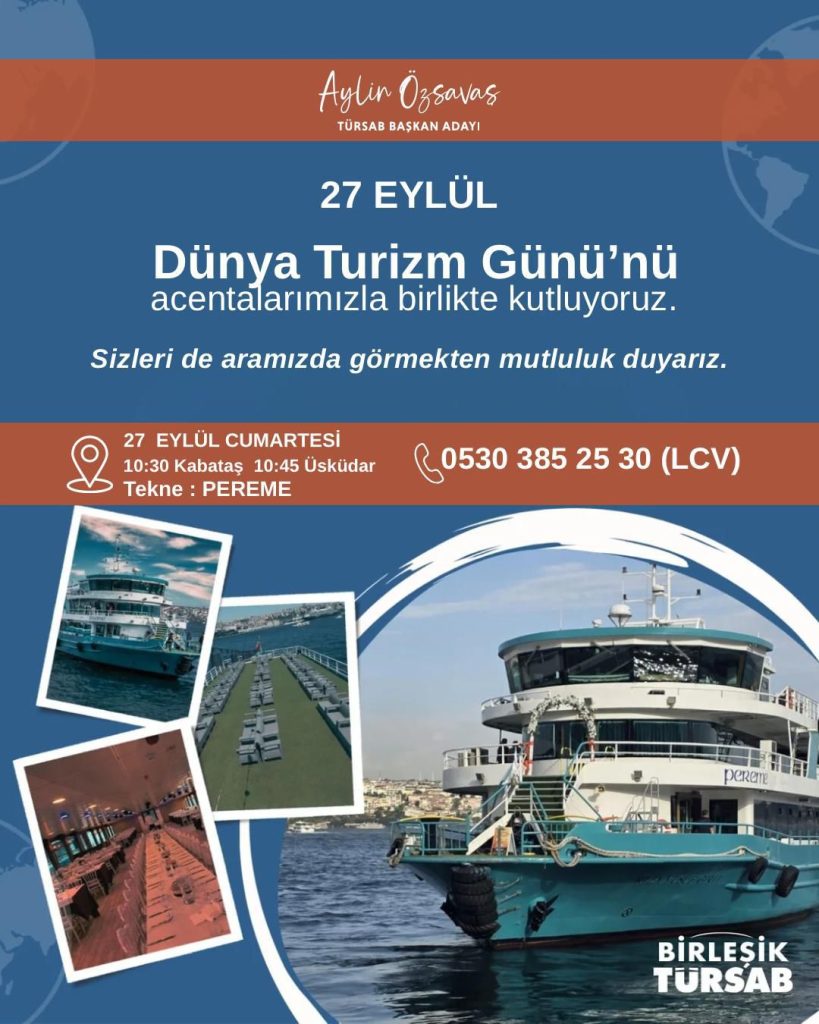 TÜRSAB Başkan Adayı Aylin Özsavaş, Dünya Turizm Günü dolayısıyla turizm acentaları ile bir araya gelecek. İstanbul Boğazı’nda düzenlenecek olan özel kutlamada, turizm sektörünün geleceğine yönelik birlik ve dayanışma mesajları verilecek.