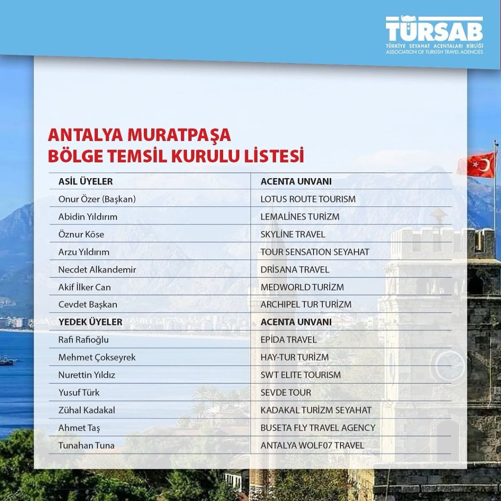 Türkiye Seyahat Acentaları Birliği, Antalya Muratpaşa seçimleriyle birlikte toplam 34 bölgede seçim sürecini sorunsuz, adil, her adaya eşit yaklaşımlı ve hukuka uygun bir şekilde tamamlamış; yeni Bölge Temsil Kurullarını oluşturmuş bulunmaktadır.